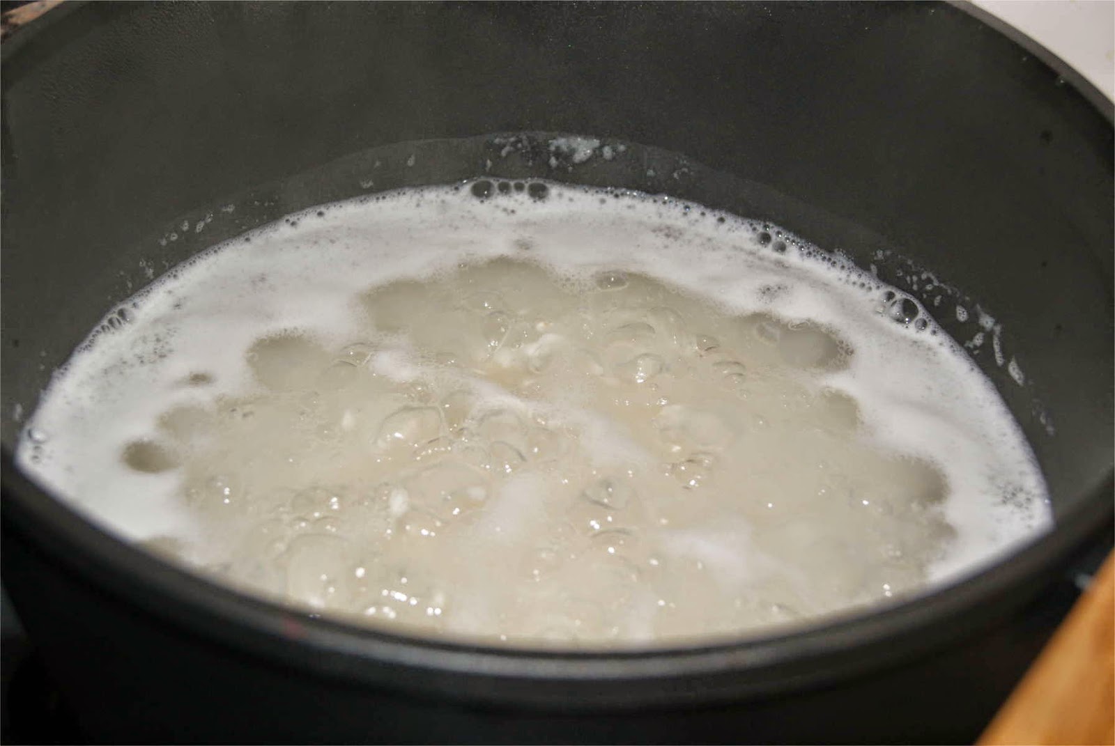 Ponemos a cocer agua con sal, en el doble de volumen que el arroz. Cuando la cacerola empiece a hervir añadimos el arroz, que dejaremos cocer a fuego vivo durante 10 minutos.