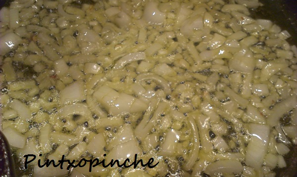 3. Cortamos la cebolla en juliana fina o en trocitos y las pochamos en el mismo aceite de las almendras.