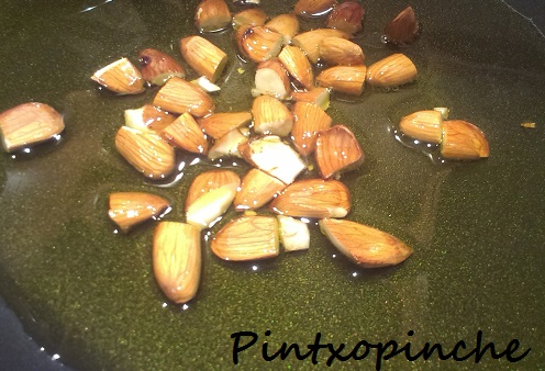 2. Freímos con un poco de aceite las almendras partidas en trozos que no sean uniformes. Retiramos cuando tengan un poco de color y reservamos.
