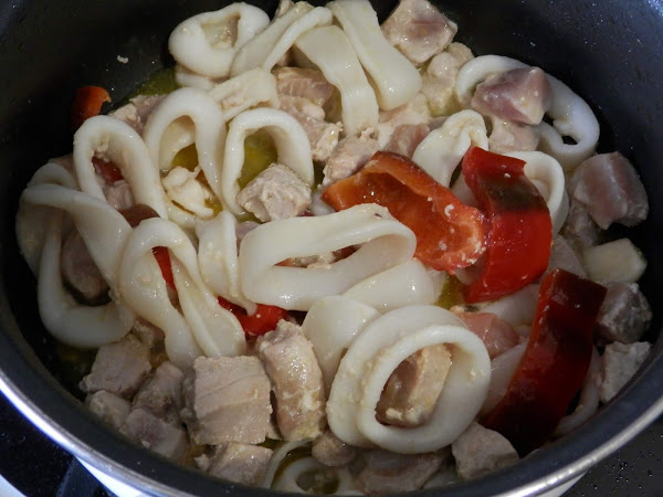 Añade ahora el pimiento y da unas vueltas, cuando empiece a estar blandito, agrega el atún cortado en tacos.