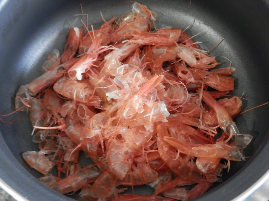 Puedes tenerlo del día de antes o congelado y hacer más cantidad, eso a gusto del consumidor, yo sofrío las cabezas y cáscaras y las machaco con una pizca de aceite de oliva y cuando ya está todo sofrito, añado un trozo de puerro y otro de apio, doy unas cuantas vueltas más y añado agua y a cocer una media hora.