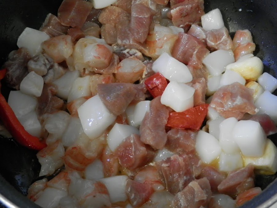 Dejamos hasta que dore el ajo y retiramos, añadiremos entonces el potón, el atún y los gambones cortados en trozos.