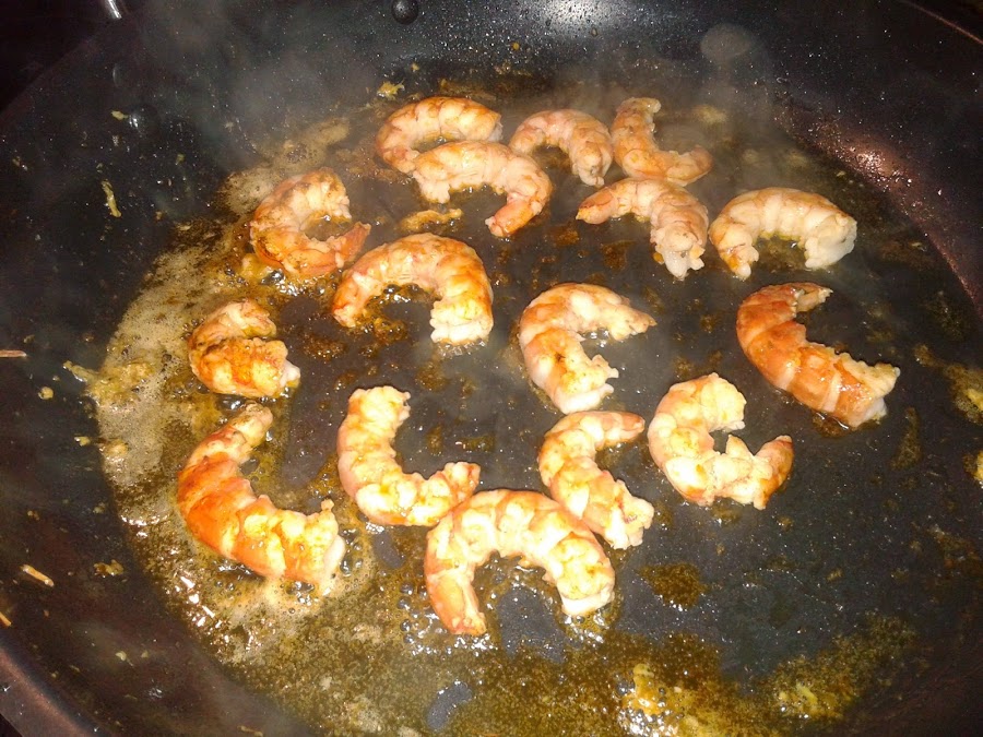 Pelamos las colas de las gambas y las echamos en el mismo aceite vuelta y vuelta.