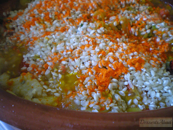 Ahora sumamos a la cazuela, el bacalao desmigado, el vino blanco, los pimientos choriceros y el majado de ajo y perejil, remover e incorporar el arroz y espolvorear con un poco de azafrán. Añadir el fumet