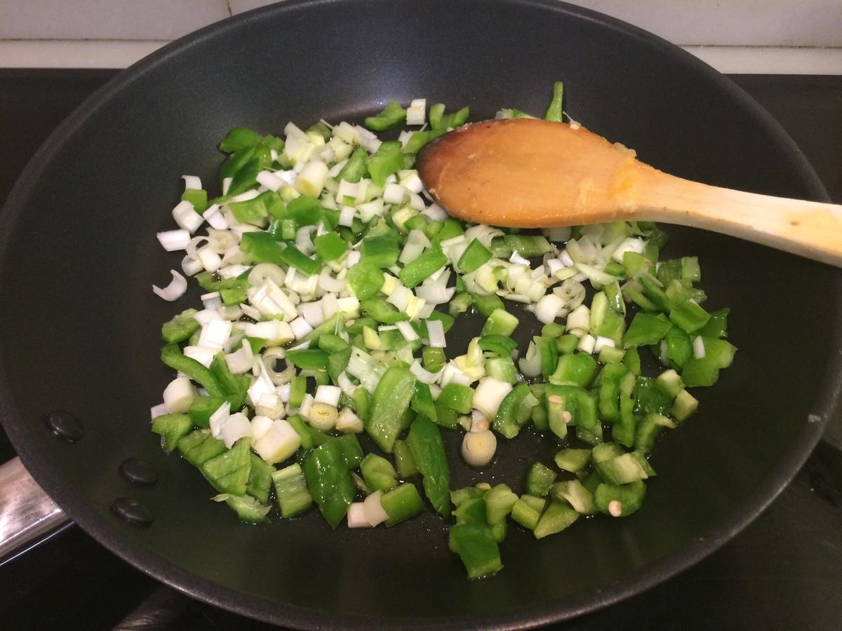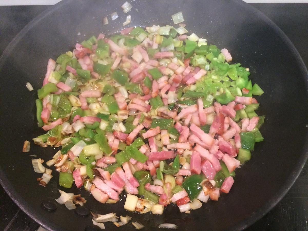 Sofreír el puerto y el pimiento y añadir depues el bacon