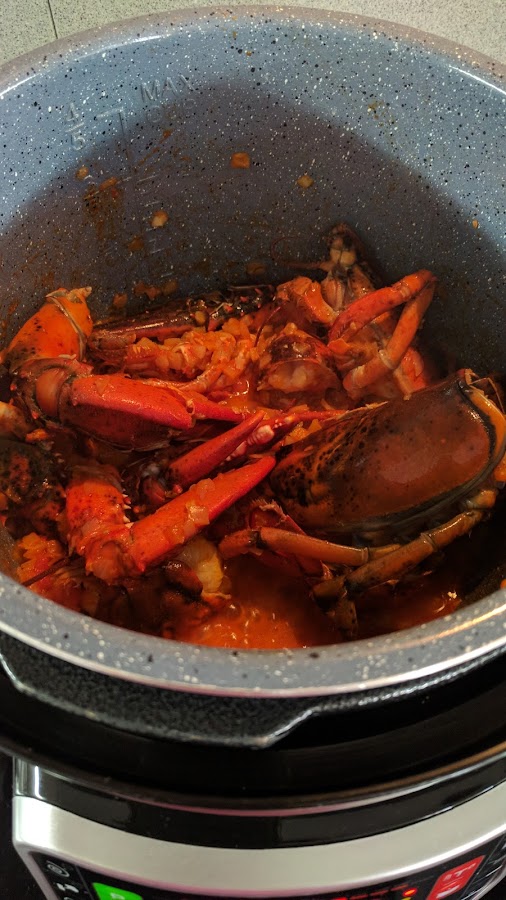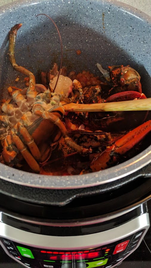 2.- salteamos los trozos de bogavante un par de minutos. Rociamos con el brandy y esperamos a que se evapore el alcohol.