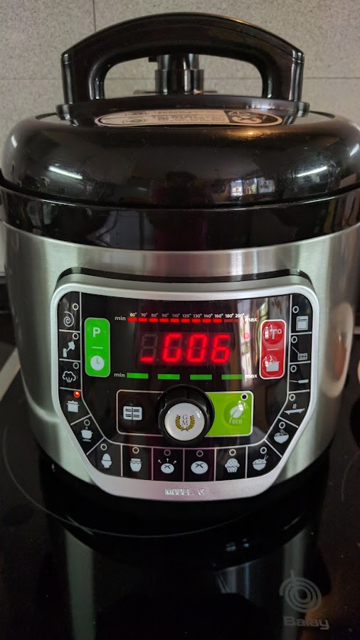 5. - cerramos y programamos menú guiso, presión predeterminada y 160 grados, 6 minutos