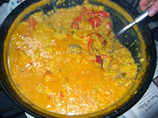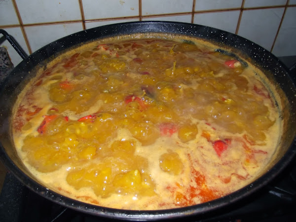 Cuando el caldo lleva cociendo quince minutos se le añaden las almejas, las tenéis que lavar bien para que no queden rastros de arena que os puedan estropear el plato, una cucharada de postre de colorante y el ajo y el perejil que habréis machado en un mortero.