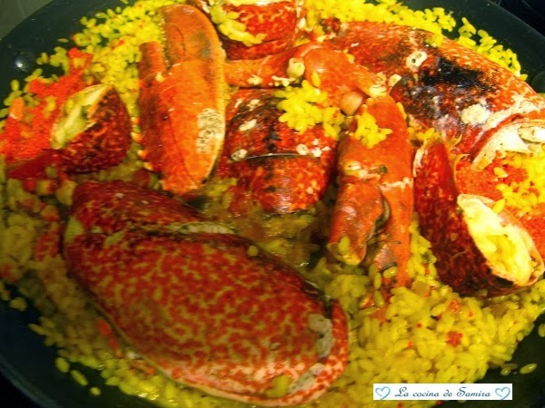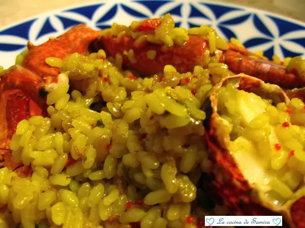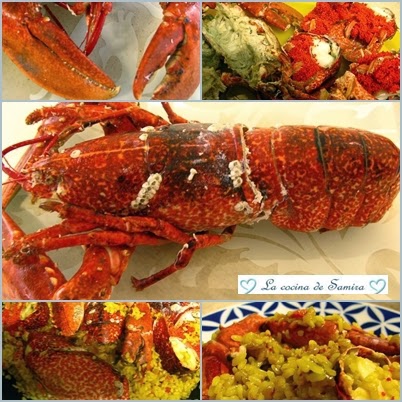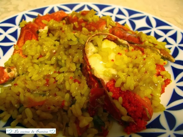 Agregamos el arroz y le damos unas vueltas con una cuchara de madera para que se impregne bien . A continuación vertemos el caldo bien caliente y dejamos hacerse unos 18 minutos a fuego medio , meneando de vez en cuando la cazuela para que no se nos pegue. Cuatro minutos antes de que sea el tiempo, añadimos el bogavante . No lo hacemos antes porque sino se resecaría . A los 18 minutos apagamos el fuego, lo tapamos con una tapa y lo dejamos así reposar otros cinco minutos.