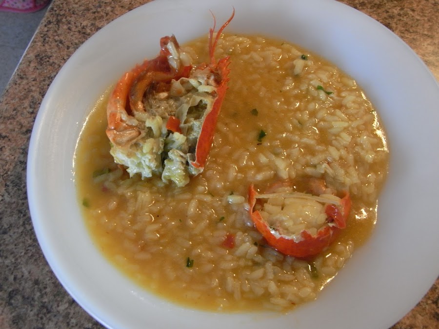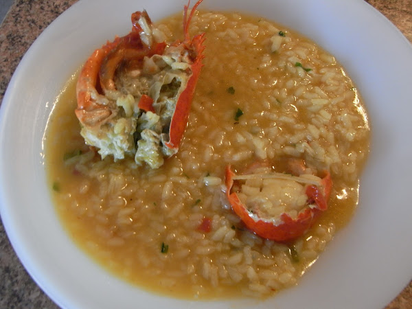 Añadimos el caldo caliente para no cortar la cocción. A media cocción se prueba de sal por si hace falta poner un poco y se añade un poco de azafrán tostado (o colorante). Cuando lleva 15 minutos se añade el bogavante, las gambas y el caldito que ha quedado en el plato, se remueve y se deja 2 minutos más. Se apaga el fuego y se deja reposando unos minutos hasta que el arroz esté en el punto óptimo.