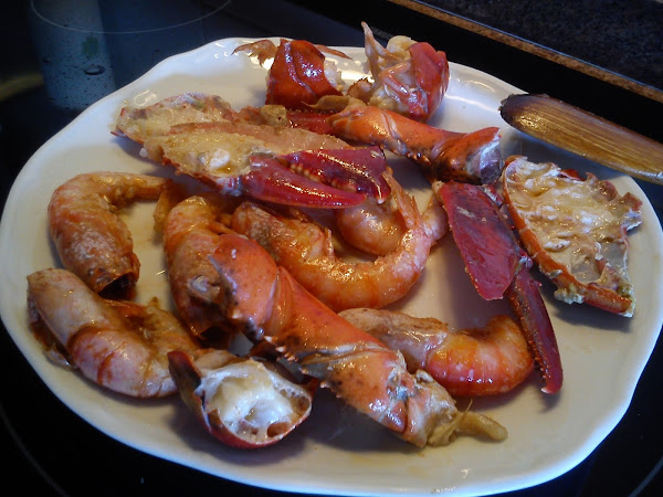 Empezamos partiendo el bogavante en crudo, a veces si no es temporada lo compro congelado y sirve igual, se deja descongelar y se parte. En este caso era fresco pero las gambas eran congeladas.