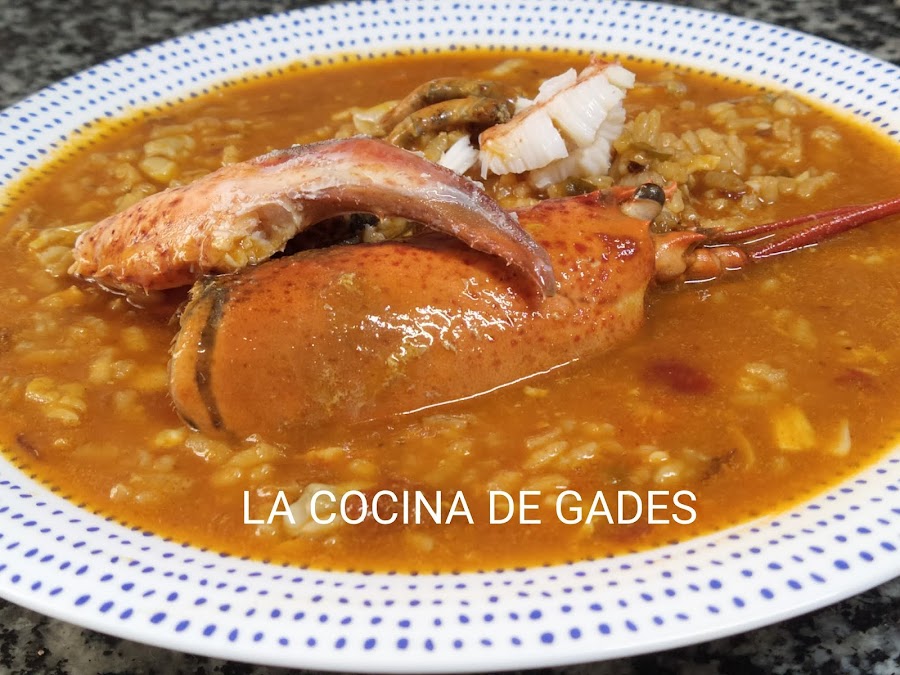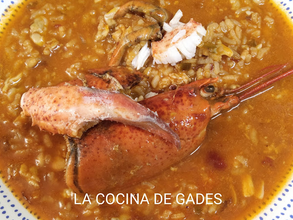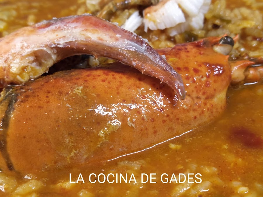Servimos el arroz con trozos de bogavante y la carne de las pinzas que hemos cocido previamente.