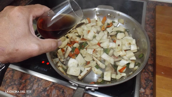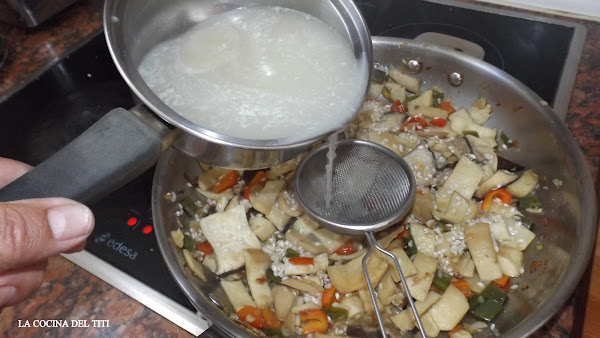 6º Esto es lo bueno de tener en el congelador nuestros caldos, fumet o jugos y para estos boletus este caldo de poca grasa nos va ir de maravillas. Asi pues iremos descongelando mientras rehogamos el arroz