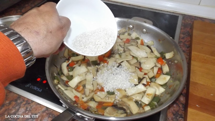5º Echamos el arroz y vamos a rehogar con los boletus y sin dejar de remover de vez en cuando para que se adhiera todo el aroma de los boletus al arroz