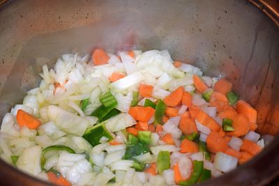 Pasa el aceite restante a una cacerola, si es necesario añade un poco más. Sofríe la cebolla y el pimiento picados. Añade la zanahoria cortada en rodajitas y cuando la cebolla esté dorada, incorpora el tomate rallado. Sofríe todo junto unos minutos.