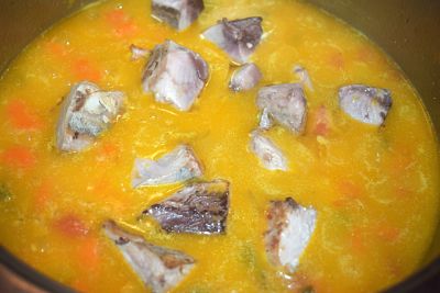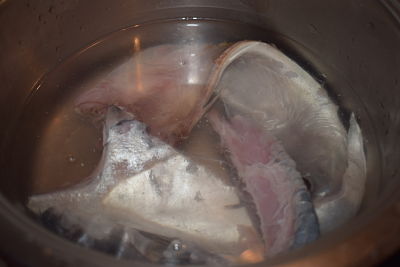 Pon las espinas y la piel en un cazo con agua y sal y cuécelas. Retira del fuego, cuela el caldo y reserva.