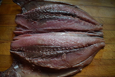 Abre el bonito por la mitad, quita la espina central y la piel.