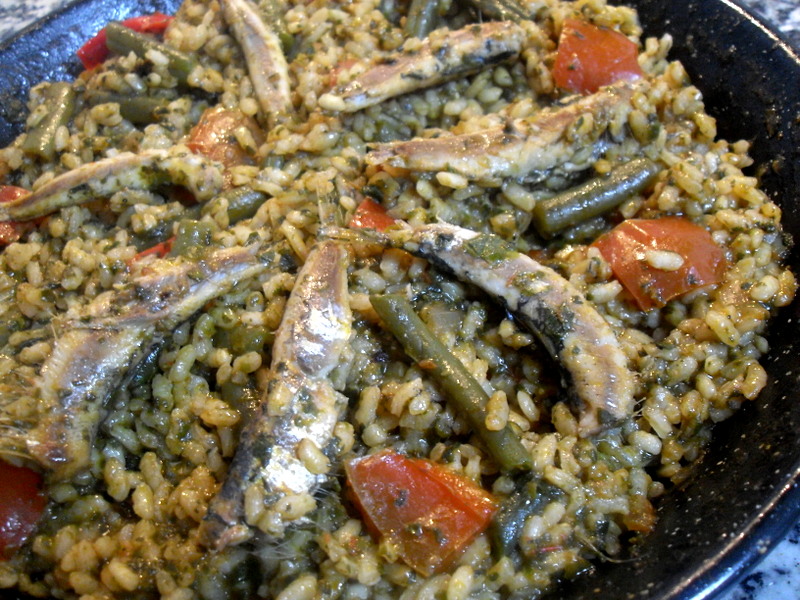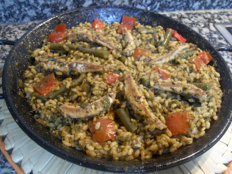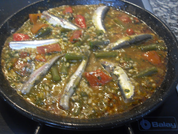 Cocer 15 minutos más agregando si falta caldo caliente, hasta quedar un arroz casi seco pero cremoso.A continuación poner los boquerones por encima del arroz y cocer a fuego medio unos 5 minutos, apartar del fuego, tapar con un trapo y dejar reposar 5 minutos, el calor residual termina de cocinar el boqueron.