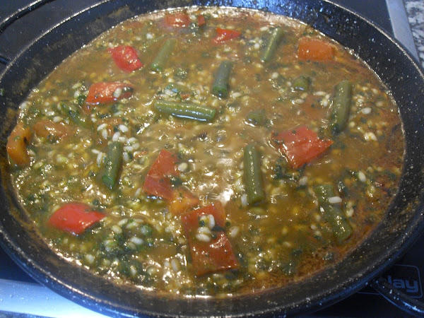 Sofreír el pimiento rojo, seguidamente los dientes de ajo picado, dorar y añadir el sofrito de tomate casero, la ñora picada, las judías verdes, las espinacas, el azafrán y sal.