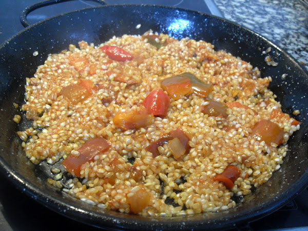Dejar cocer 10 minutos, seguidamente añadir el arroz y rehogar unos minutos, añadir el doble de su volumen en caldo de pescado.