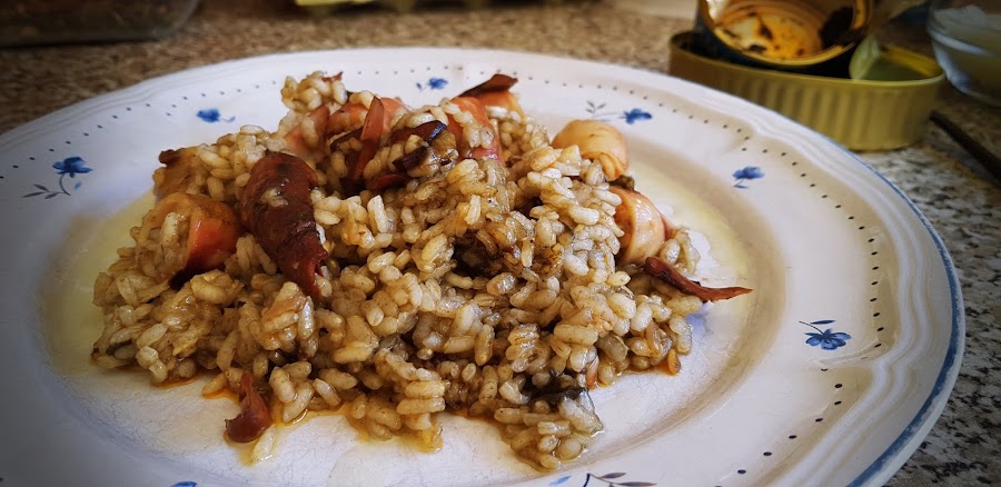 5. Una vez mezclado todo, echamos el arroz y removemos durante unos cinco minutos o hasta que el arroz empape todo el sofrito.