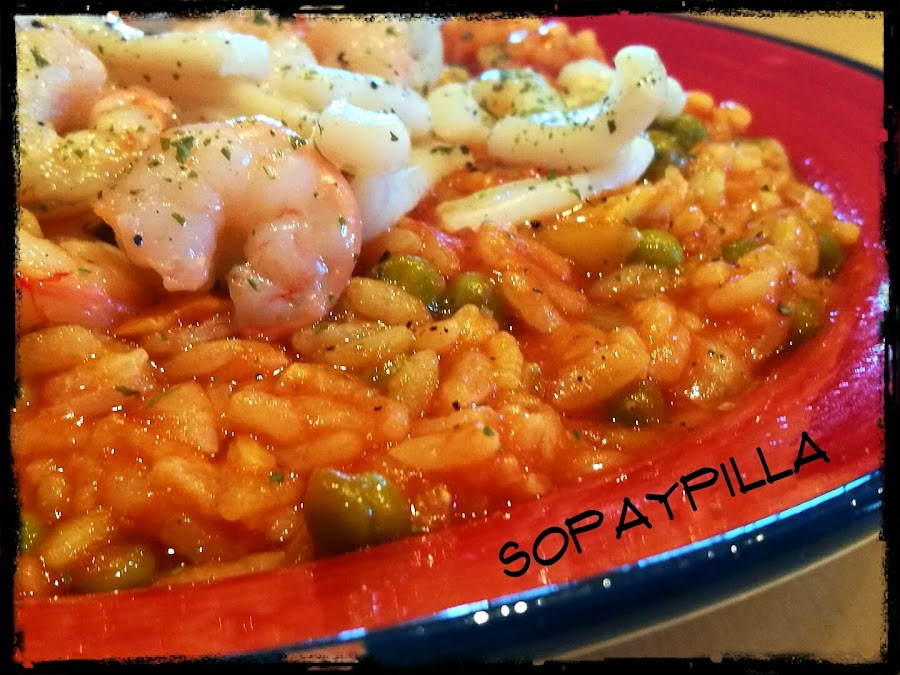 Probando recetas de las que venían en el libro de la actifry 2en1, (freidora sin aceite) la verdad que alguna ha salido mal, pero esta del arroz la voy a hacer muchas más veces, por lo práctico que es, que no te tienes que preocupar de remover ni sufrir porque te haga una pasta de arroz, y por lo riquísimo que queda. De todas maneras, por si os ayuda, los fritos quedan estupendos sin nada de aceite. Las patatas también, crujientes por fuera y tiernas por dentro...una pasada!
