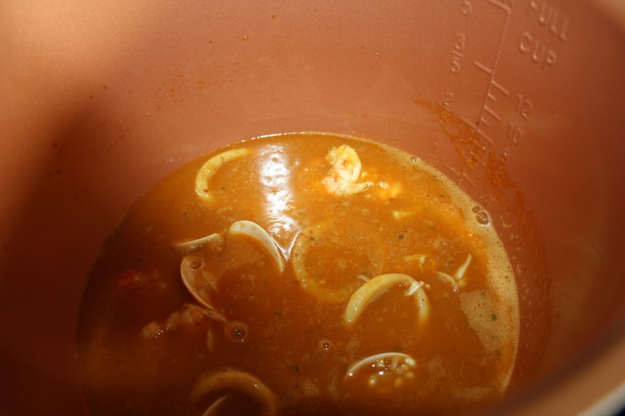 En la cubeta, echamos un par de cucharadas de AOVE, y programamos menú sofreir a 130º. Echamos los calamares y los langostinos, y removemos durante un par de min, hasta que veamos que el langostino ha cambiado de color.