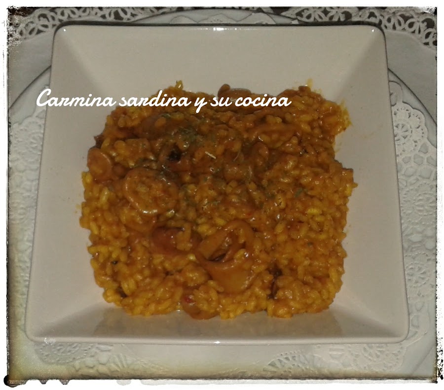 Echar el arroz y el azafrán y sofreír 2m. hasta que el arroz cambie de color. Verter el caldo de pescado hirviendo.