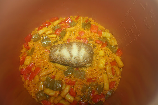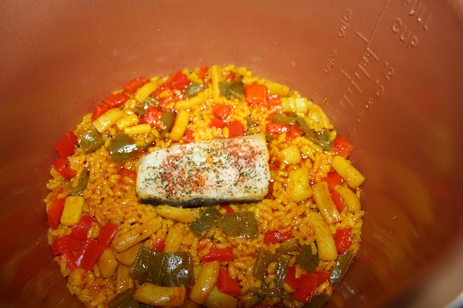 Cancelamos menú. Sobre el arroz colocamos el lomo de merluza salpimentado y espolvoreado ligeramente con ajo y perejil. Programamos menú arroz a 130º.