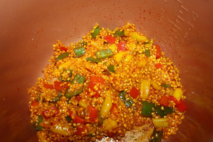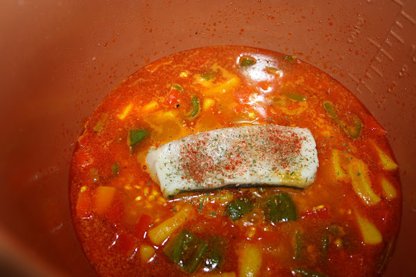 Incorporamos el caldo de los mejillones a la cubeta, y añadimos las especias. Removemos bien y añadimos el agua.