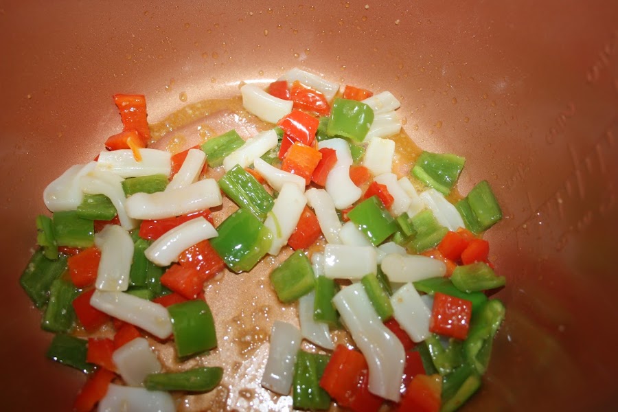 Es el momento de añadir el calamar, vamos removiendo junto con el pimiento durante un par de minutos.