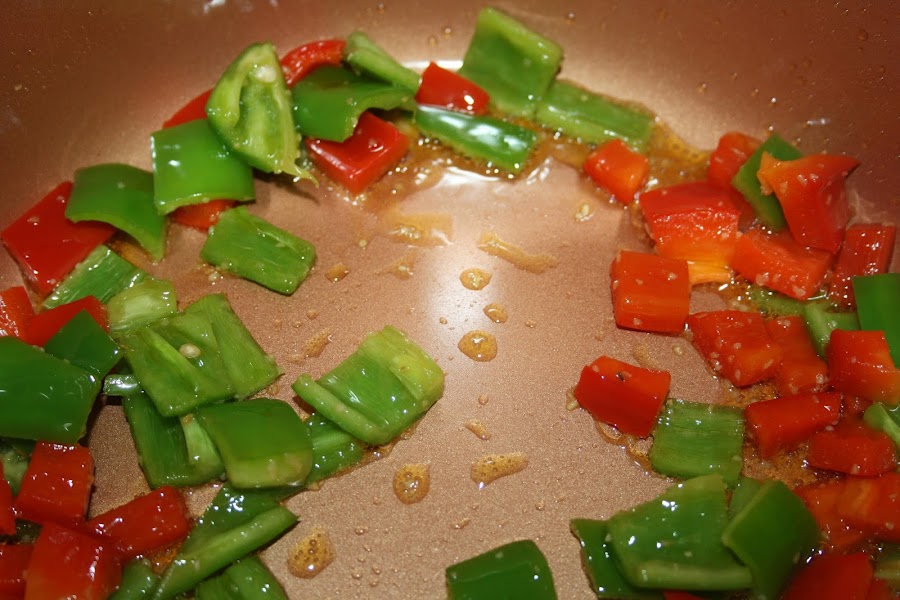 Ponemos en la cubeta 1 cucharada de aceite y programamos menú sofreir a 120º. Cuando el aceite esté caliente incorporamos el pimiento y lo sofreimos durante 5 minutos aproximadamente.