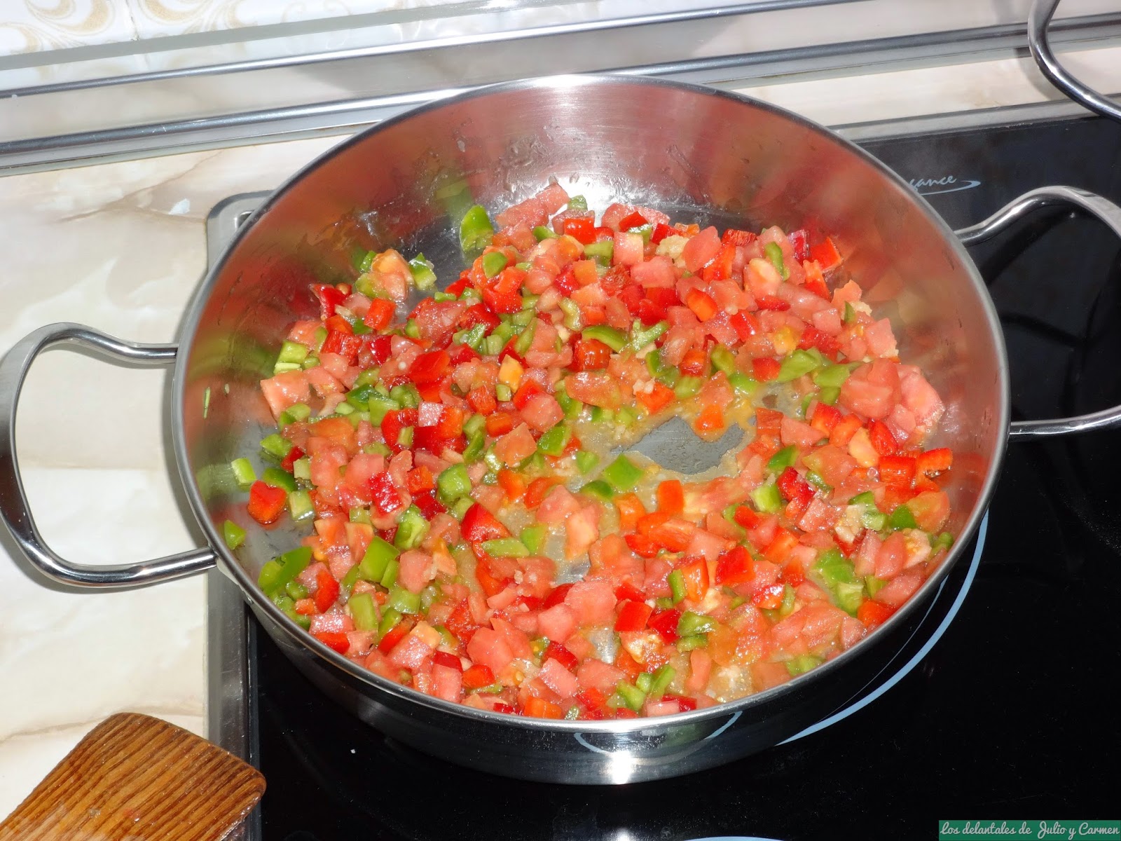Primero, escaldaremos el tomate y lo pelamos y picamos finito. Los pimientos los lavamos bien y los partimos en trocitos pequeños, al igual que los ajos. Reservamos.