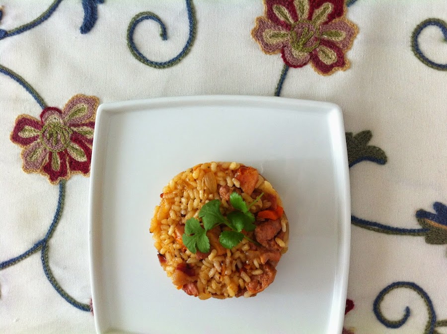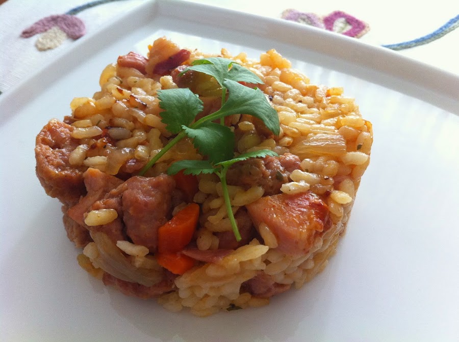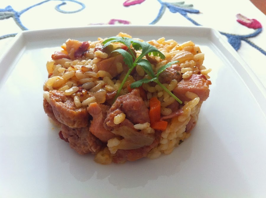 En la paella o cacerola ponemos a dorar la cebolla, la zanahoria y el ajo. Seguidamente, echamos los trozos de lomo y finalmente las salchichas . Incorporamos el arroz y lo rehogamos. Por último, echamos el agua y lo dejamos a fuego lento sin removerlo 15-18min. Cuando ya esté cocido, dejamos reposar tapando la paella con un trapo o papel.