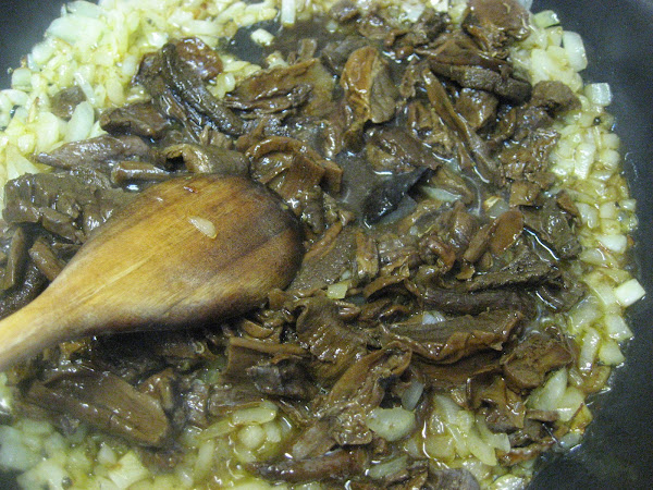 4º " En una cazuela colocamos la cebolla y los Ceps, le añadimos la nuez de mantequilla y una copa de vino blanco, dejamos reducir un momento hasta que se evapore el alcohol del vino y echamos el arroz, removemos un momento y comenzamos a añadirle el caldo de verduras con el caldo de Ceps que habíamos preparado.