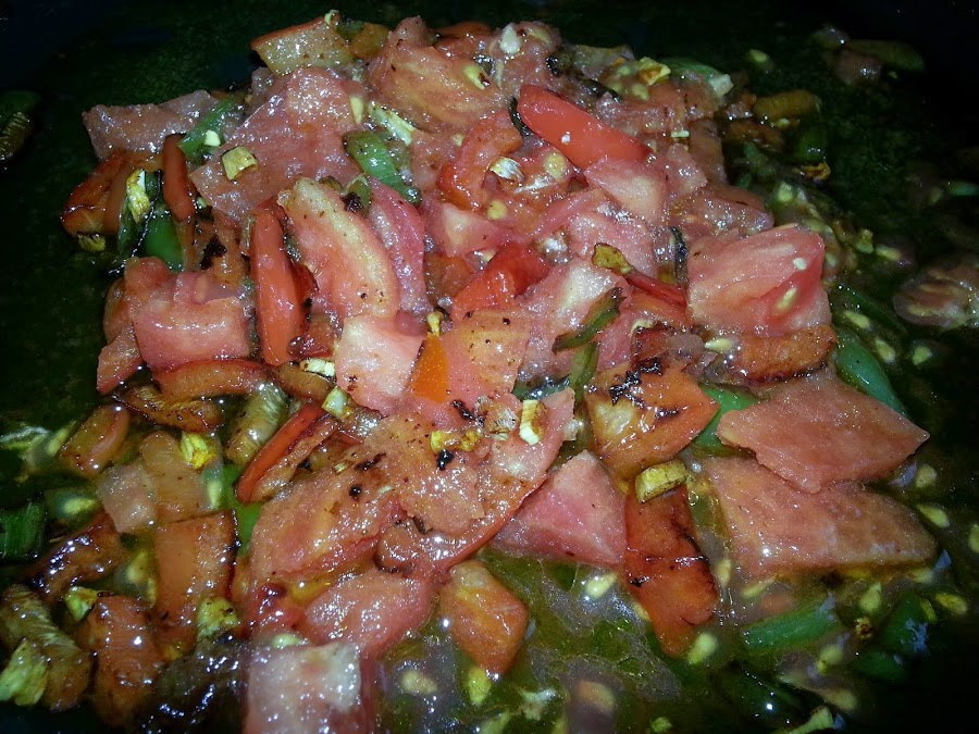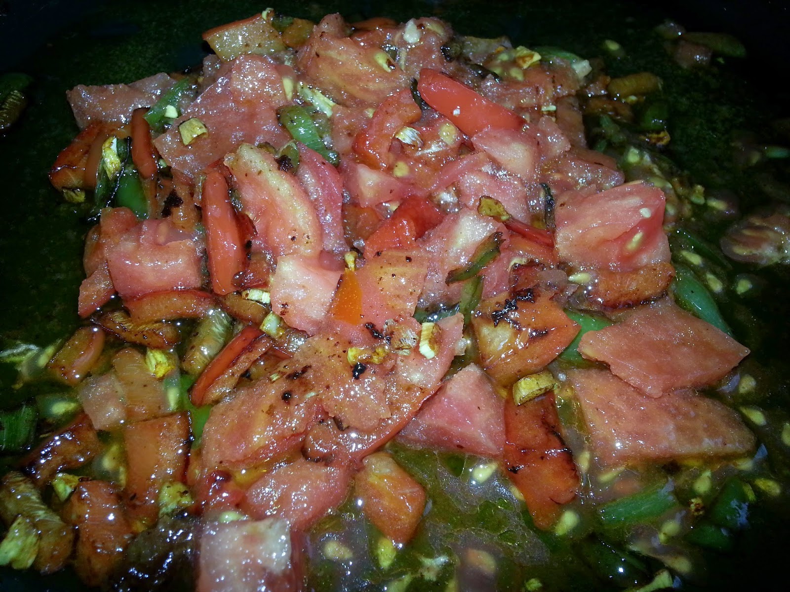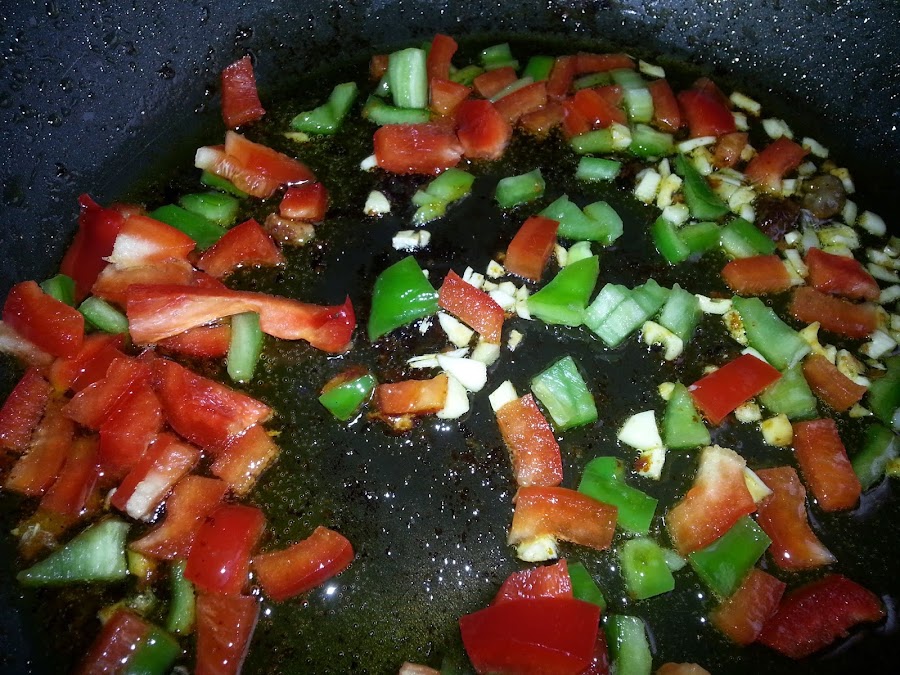 En ese mismo aceite ponemos los ajos y pimientos troceados, una vez que están fritos incorporamos los tomates pelados y troceados.