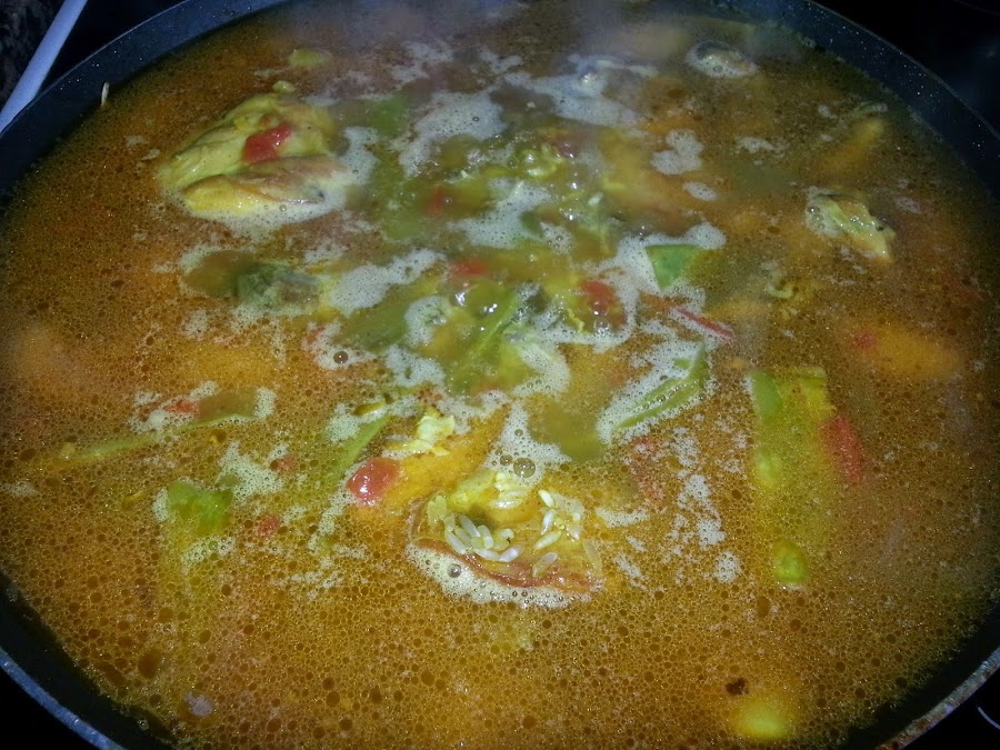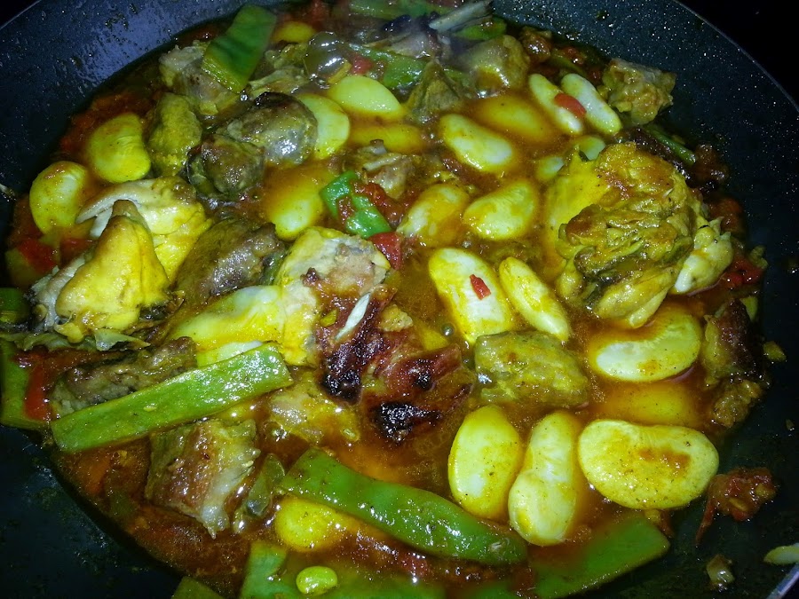 No puedo indicar tiempo exactos porque depende del jugo que suelten los tomates el que tarde mas o menos en cocinarse; así una vez reducido el caldo y bien refritos los tomates añadimos la carne, los garrafones y las habichuelas ( si estas últimas son nuevas y blandas podemos incorporarlas en crudo, en caso contrario tendríamos que cocerlas en agua hirviendo aproximadamente 10 minutos ante de añadirlas.).