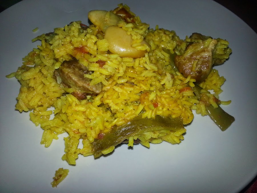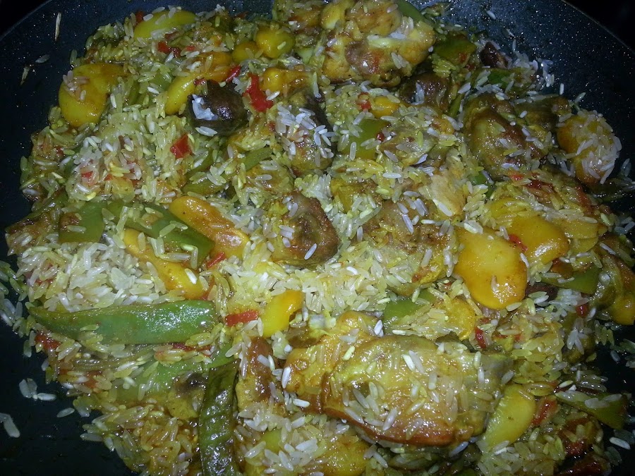 En una sartén con un poco de aceite de oliva ponemos las carnes de pollo y cerdo para que se doren y suelte sabor, apartamos la carne y reservamos.