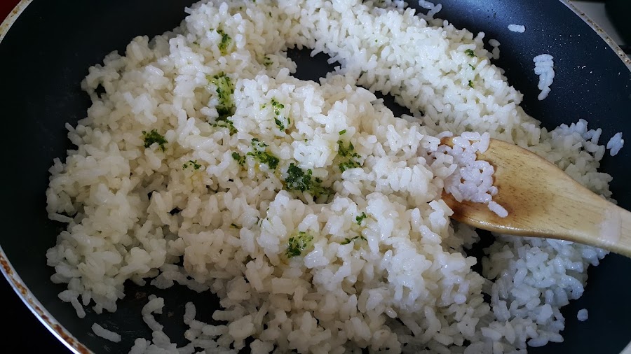 Una vez salteados los chipirones los apartamos y en la misma sartén salteamos el arroz. Añadimos una cucharada de aliño y lo pasamos a fuego fuerte 2-3 minutos.