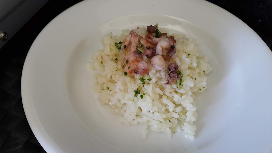 Y ya sólo nos queda emplatar y a comer. Juntamos el arroz con los chipirones y lo aliñamos con la mezcla que teníamos preparada.