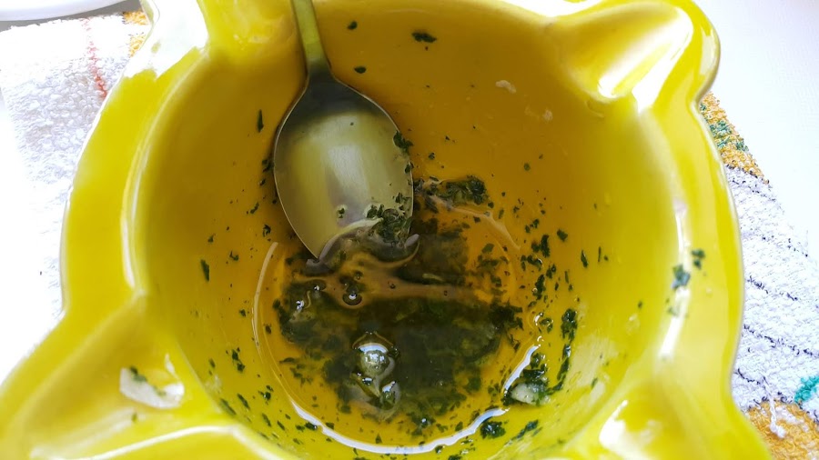 En un mortero machacaremos el diente de ajo junto con una cucharada de perejil y le añadiremos 2 cucharadas de postre de aceite para terminar el aliño.
