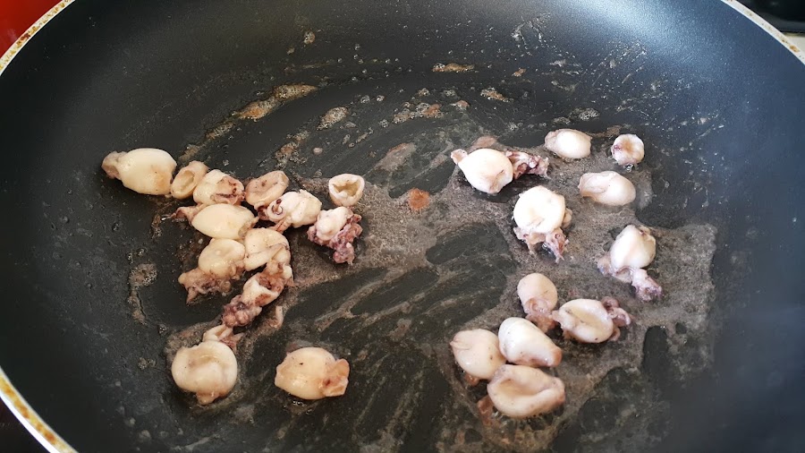 Mientras limpiaremos bien los chipirones y los saltearemos en una sartén.
