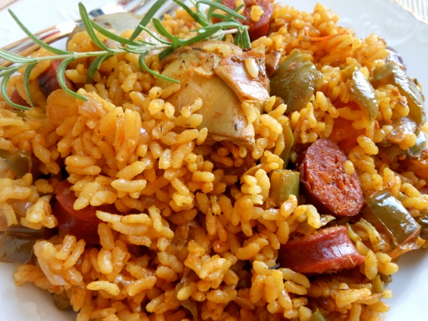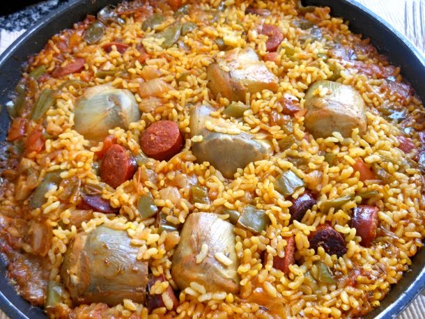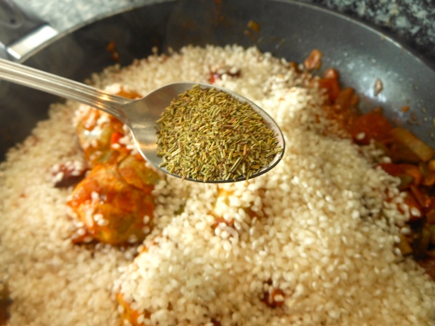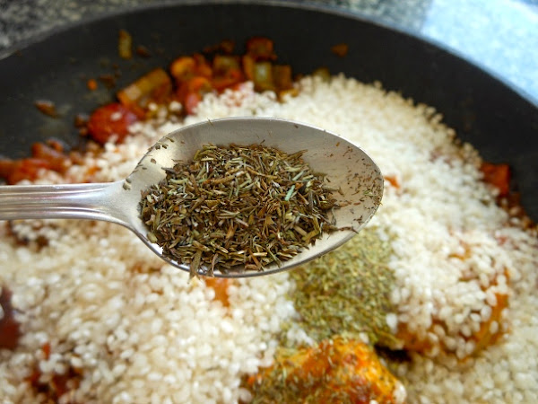Seguidamente agrega el arroz, la cucharadita de tomillo, la de romero y las alcachofas congeladas. Remueve bien con tu cuchara de madera y añade a continuación la cucharadita de pimentón, vuelve a remover, vierte el caldo de pollo, el sobrecito de azafrán molido y la media cucharadita de pimienta negra molida.