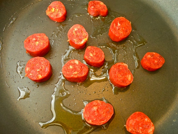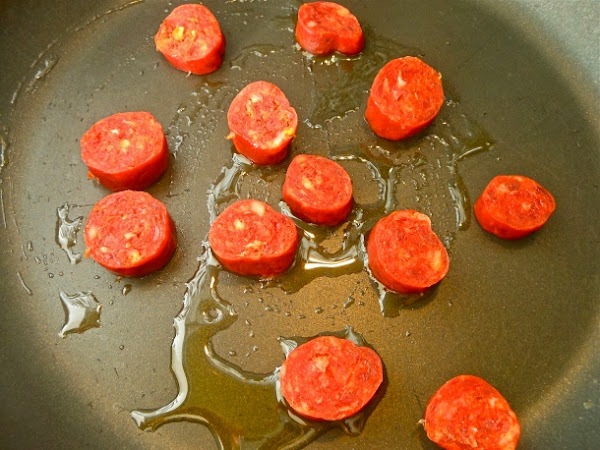Cuando el aceite esté caliente añade las rodajas de chorizo y sofríelas durante 1 minuto girándolas a mitad de cocción. Después apártalas y resérvalas.