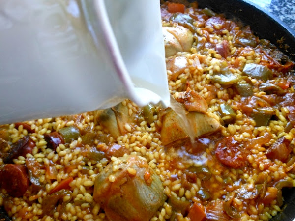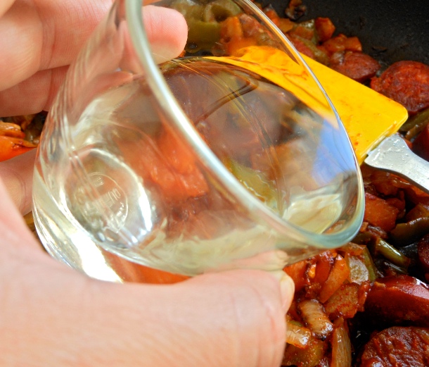 A continuación, vuelve a poner las rodajas de chorizo, vierte el medio vaso de vino blanco seco y deja unos minutos la paellera destapada para que el alcohol se evapore.