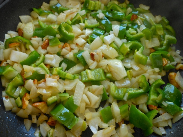 Añade a continuación, la cebolla y el pimiento troceado junto a una poquita de sal fina. Baja el fuego, tapa la paellera y deja que las hortalizas se ablanden durante 15 minutos.