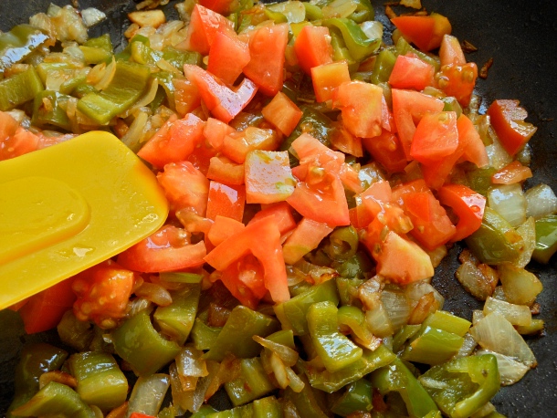 Mientras las hortalizas se cocinan, lava bajo el chorro del agua del grifo el tomate, sécalo con un trozo de papel de cocina y pícalo.