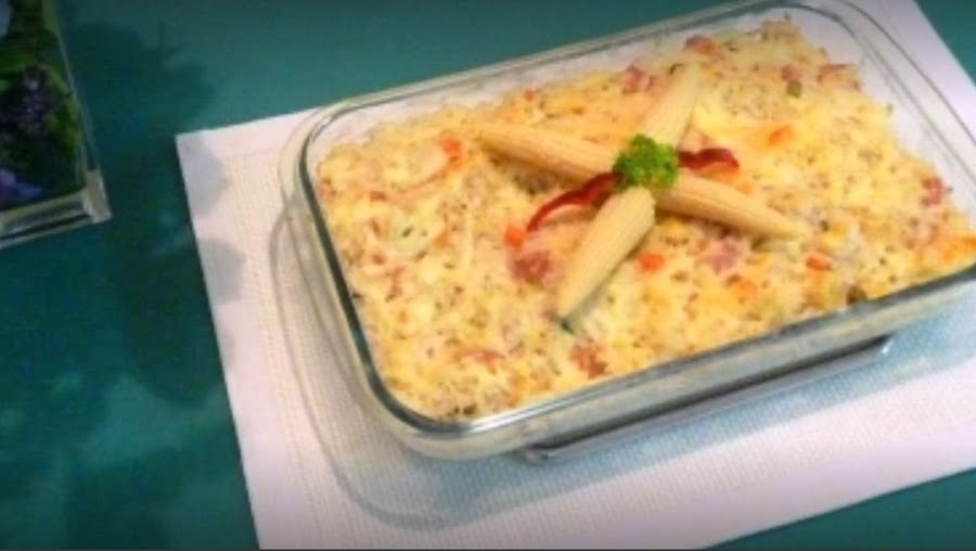 unos segundos hervir,luego colocamos la zanahoria,los elotes tiernos,pimiento morrón picado,salsa inglesa mostaza,pimienta,perejil y picante revolver,agregar el arroz ya reventado mezcle con dos tenedores pasar a un pirex grande y servir,opcional rociar con