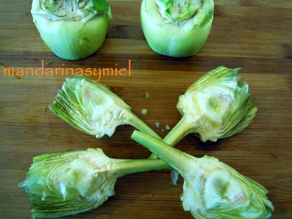 Pela y corta en cuatro trozos las alcachofas, ponlas en agua con limón hasta que vayas a gastarlas.