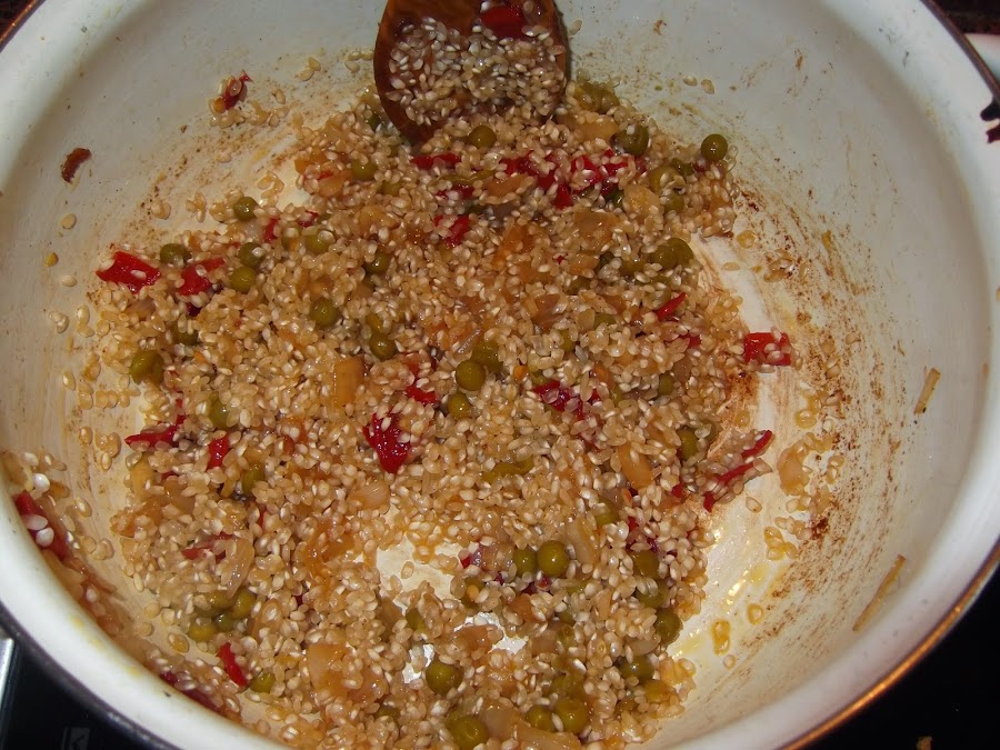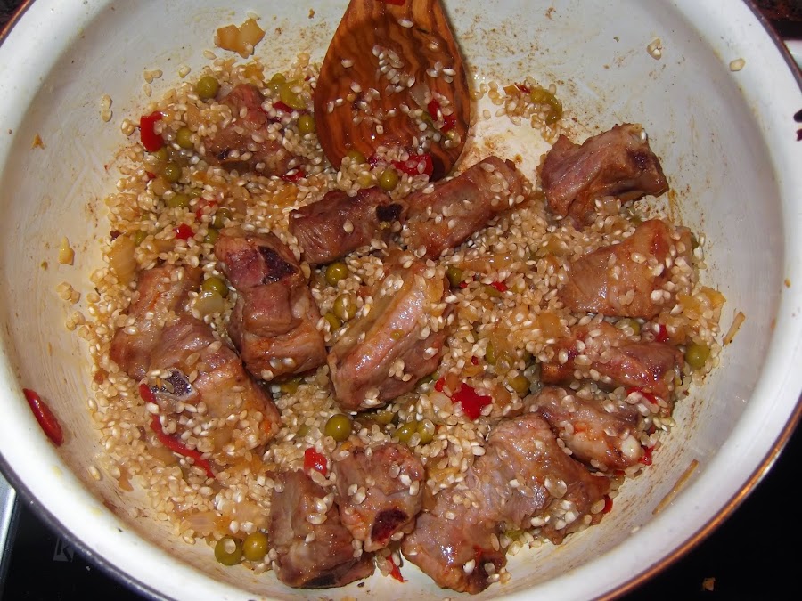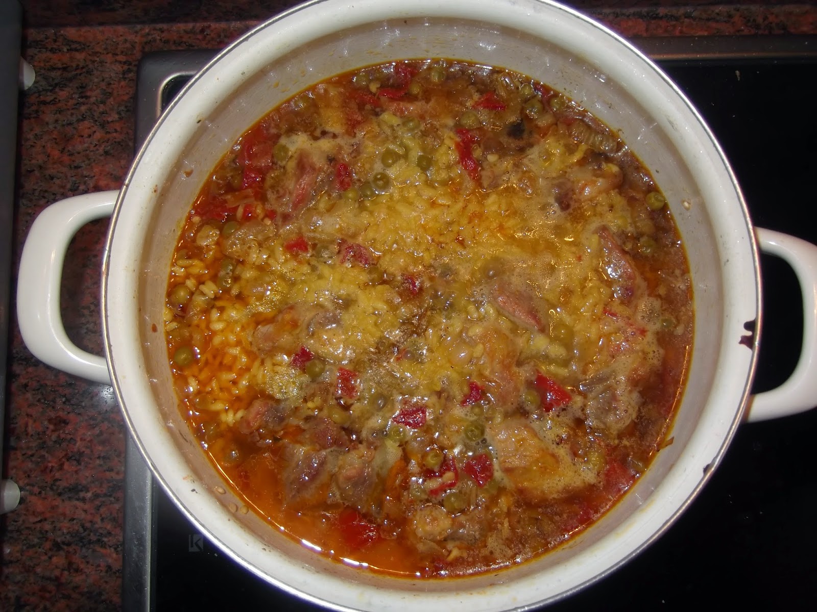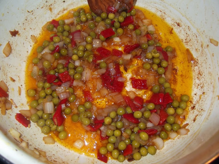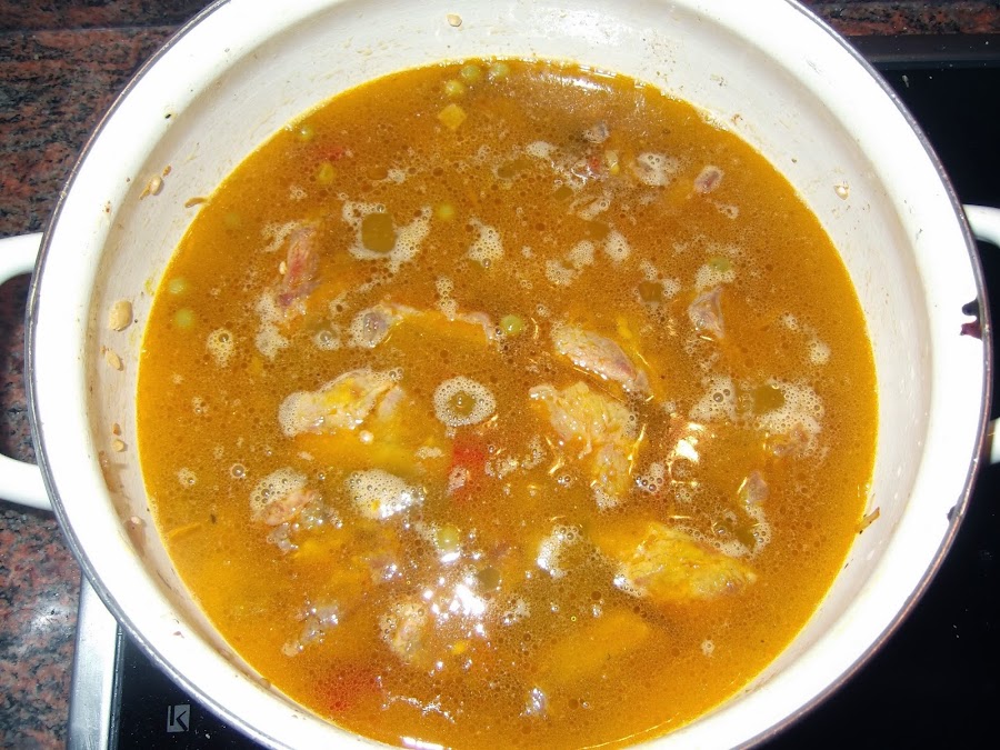 Una vez que tenéis la cebolla dorada, añadís los pimientos, si en vez del piquillo habéis utilizado naturales, echarlos cuando la cebolla para que se cocinen bien. Un par de vueltas y añadís los guisantes, saláis el sofrito y echáis el arroz, le dais un par de vueltas para que coja color, añadís las costillas y una vez que tenéis todos los ingredientes en la perola añadís el doble de agua que de arroz. Es decir yo de arroz he puesto una taza pues de agua le ponéis dos, aunque yo siempre le suelo echar un poco más. Ahora saláis el caldo, le echáis un poco de colorante y lo ponéis a fuego fuerte. Una vez que empiece a hervir lo bajáis a fuego medio bajo y lo dejáis unos 20 minutos.